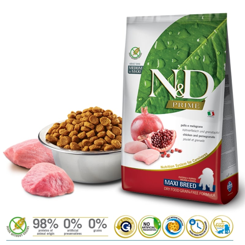 Πλήρης τροφή χωρίς σιτηρά, με κοτόπουλο και ρόδι για κουτάβια μεγαλόσωμων και γιγαντόσωμων φυλών, κυοφορούσες ή θηλάζουσες σκύλες.